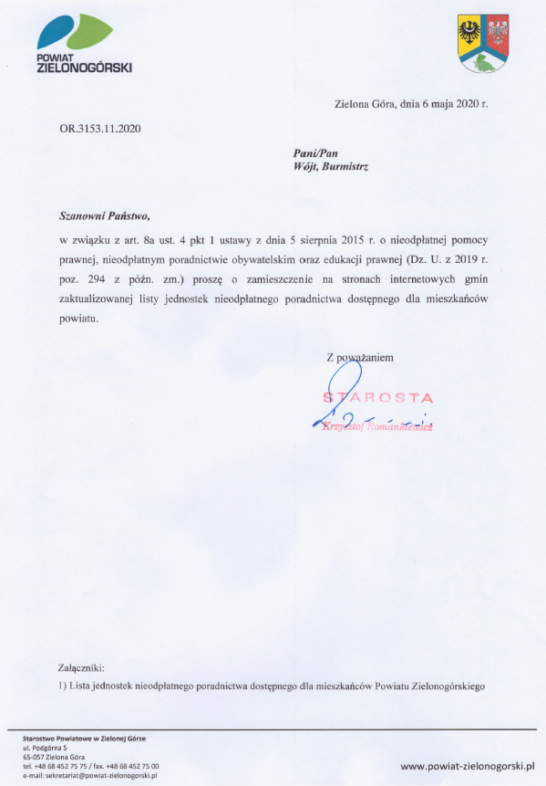 Lista jednostek nieodpłatnego poradnictwa dostępnego dla mieszkańców Powiatu Zielonogórskiego