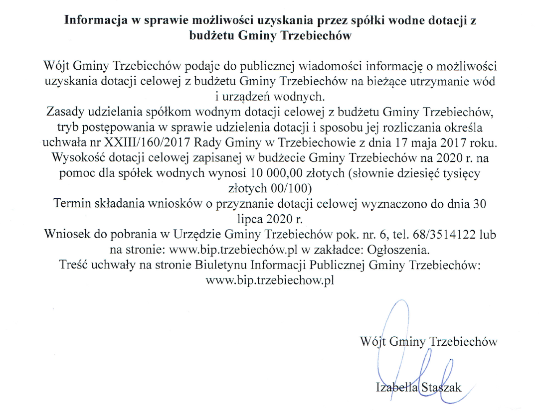 Informacja w sprawie możliwości uzyskania przez spółki wodne dotacji z budżetu Gminy Trzebiechów