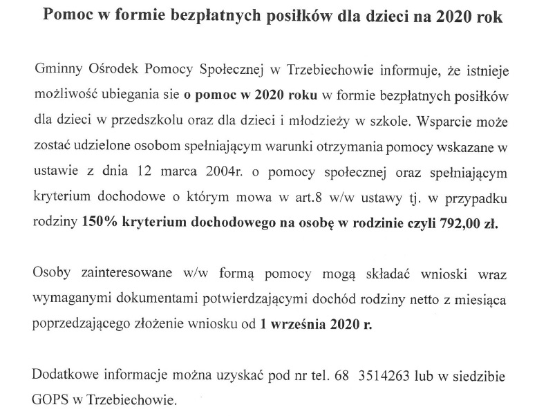 Pomoc w formie bezpłatnych posiłków dla dzieci na 2020 rok