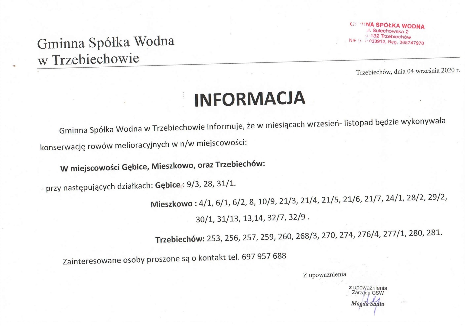 Informacja o pracach realizowanych przez Gminna Spółkę Wodną w Trzebiechowie