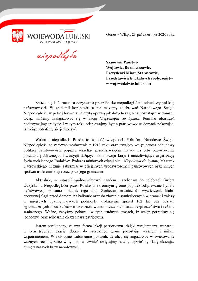 Zaproszenie Wojewody Lubuskiego do akcji Niepodległa do hymnu