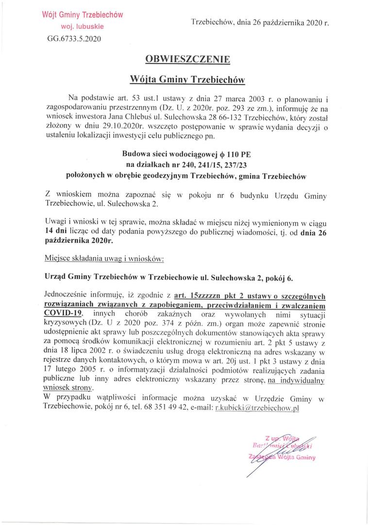 OBWIESZCZENIE Wójta Gminy Trzebiechów z dnia 26 października 2020 r.