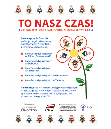 Stowarzyszenie Ducatrix, które reprezentuję jest w trakcie realizacji projektu pt.: "To nasz czas. Aktywizacja kobiet zamieszkujących obszary wiejskie." W ramach projektu współpracujemy z 5 kołami gospodyń wiejskich, w tym z KGW Ostrzyce z gminy Trzebiechów.
