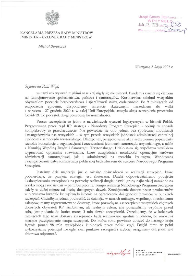 Pismo w sprawie szczepień na COVID-19 - Kancelaria Prezesa Rady Ministrów