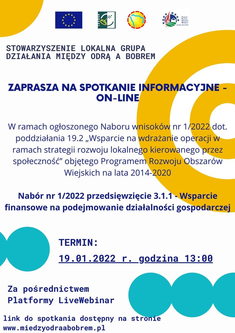 Stowarzyszenie LGD Między Odrą a Bobrem informuje, że dnia 19 stycznia 2022 r.o godz. 13:00 odbędzie się w trybie on-line SPOTKANIE INFORMACYJNE dla osób planujących złożyć wniosek w odpowiedzi na nabór nr 1/2022 dot. przeds. 3.1.1 Wsparcie finansowe na podejmowanie działalności gospodarczej.