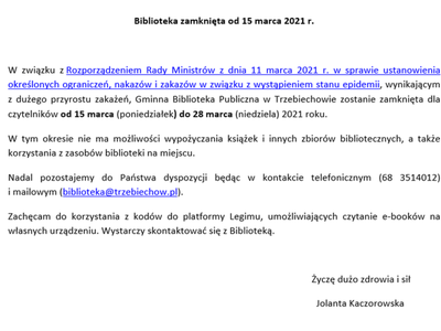 Biblioteka zamknięta od 15 marca 2021