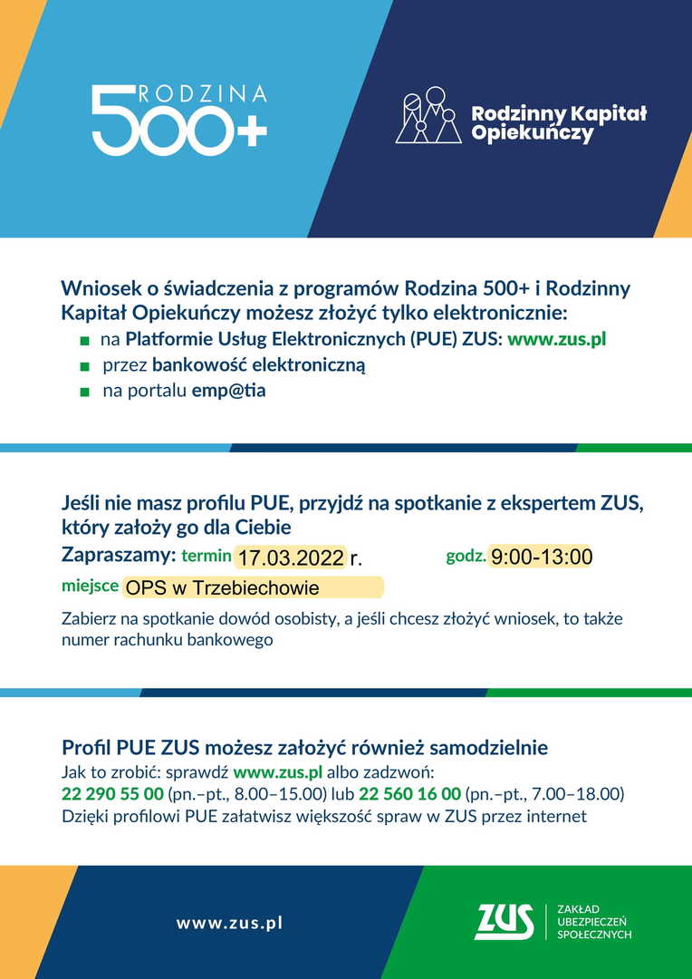 Informujemy, że Oddział ZUS w Zielonej Górze w ramach wsparcia klientów w złożeniu wniosków o świadczenia rodzinne (RKO i 500 +) 17 marca 2022 r. w godzinach od 9.00 do 13.00 organizuje dyżur tzw. PUE-room w Ośrodku Pomocy Społecznej w Trzebiechowie.