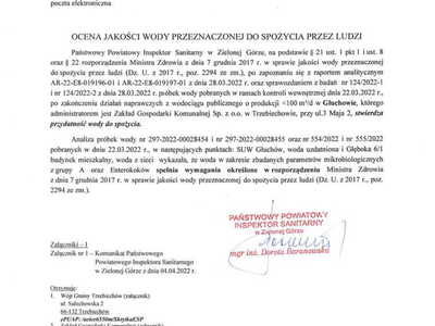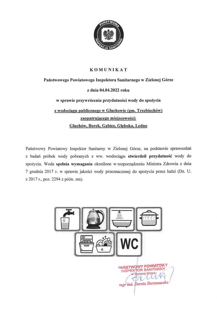 Komunikat z dn. 04.04.2022 w sprawie przywrócenia przydatności wody do spożycia z wodociągu publicznego w Głuchowie