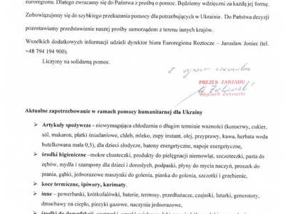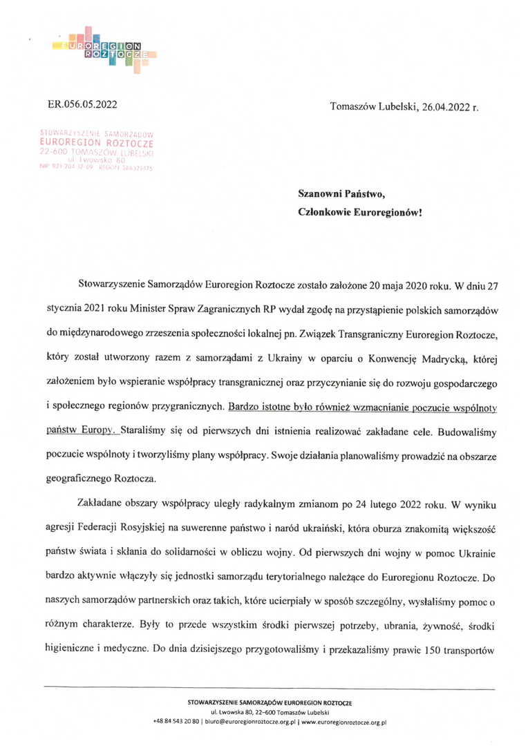 Pismo z Euroregionu Roztocze dot. pomocy dla Ukrainy