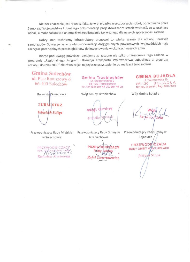 Stanowisko gmin w sprawie przebudowy i rozbudowy drogi wojewódzkiej nr 278 na odcinku Sulechów - Konotop