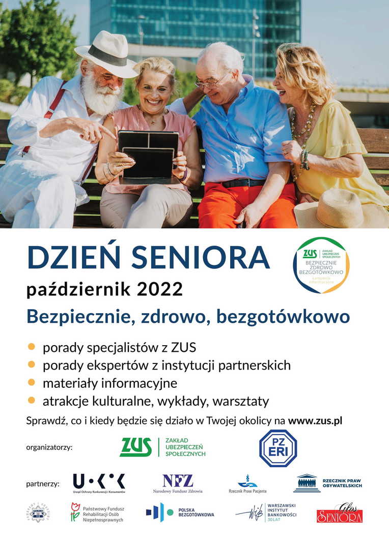 Już po raz kolejny ZUS oraz Polski Związek Emerytów, Rencistów i Inwalidów organizują Dzień Seniora. W całym kraju, pod hasłem „Bezpiecznie, zdrowo, bezgotówkowo”, odbędą się różne wydarzenia dla osób starszych. Uczestnicy będą mogli skorzystać z porad ekspertów ZUS i specjalistów z innych instytucji. Wszystkie wydarzenia są otwarte, a udział w nich – bezpłatny.