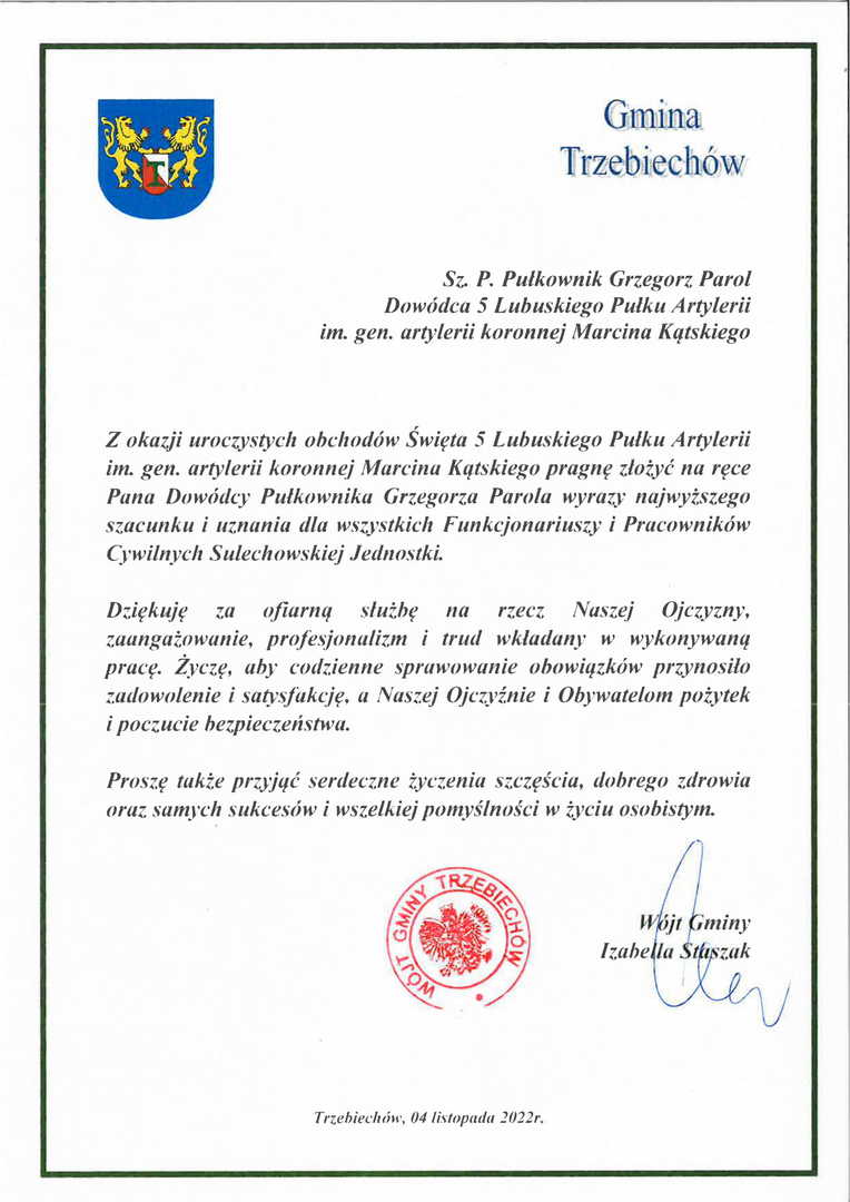 Z okazji obchodów Święta 5 Lubuskiego Pułku Artylerii im. gen. artylerii koronnej Marcina Kątskiego
