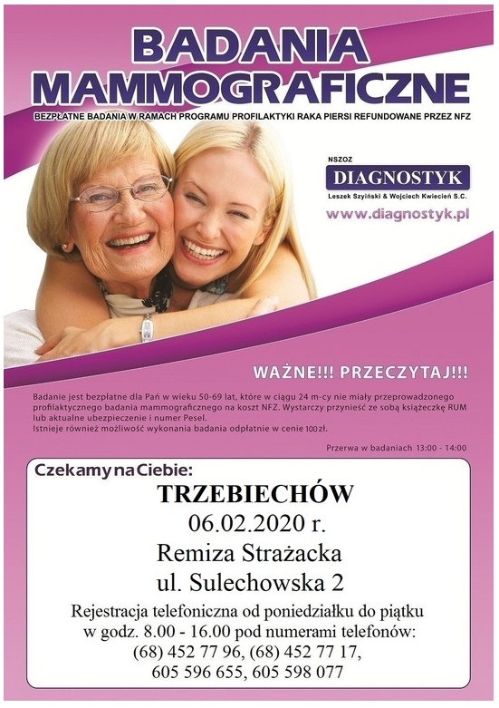 Dnia 6 lutego 2020 r. przy Remizie Strażackiej w Trzebiechowie przeprowadzane będą bezpłatne badania mammograficzne dla kobiet w wieku od 50 do 69 lat, które w ciągu ostatnich dwóch lat nie miały wykonywanych tego typu badań. Panie, które nie będą spełniały tych warunków będą mogły mieć wykonane badania odpłatnie w cenie 100 zł. Bardzo zależy nam na tym aby dotrzeć do mieszkanek urodzonych w latach: 1966 r. - 1970 r. - te Panie mogą już wykonać badanie w ramach Populacyjnego Programu Wczesnego Wykrywania Raka Piersi.