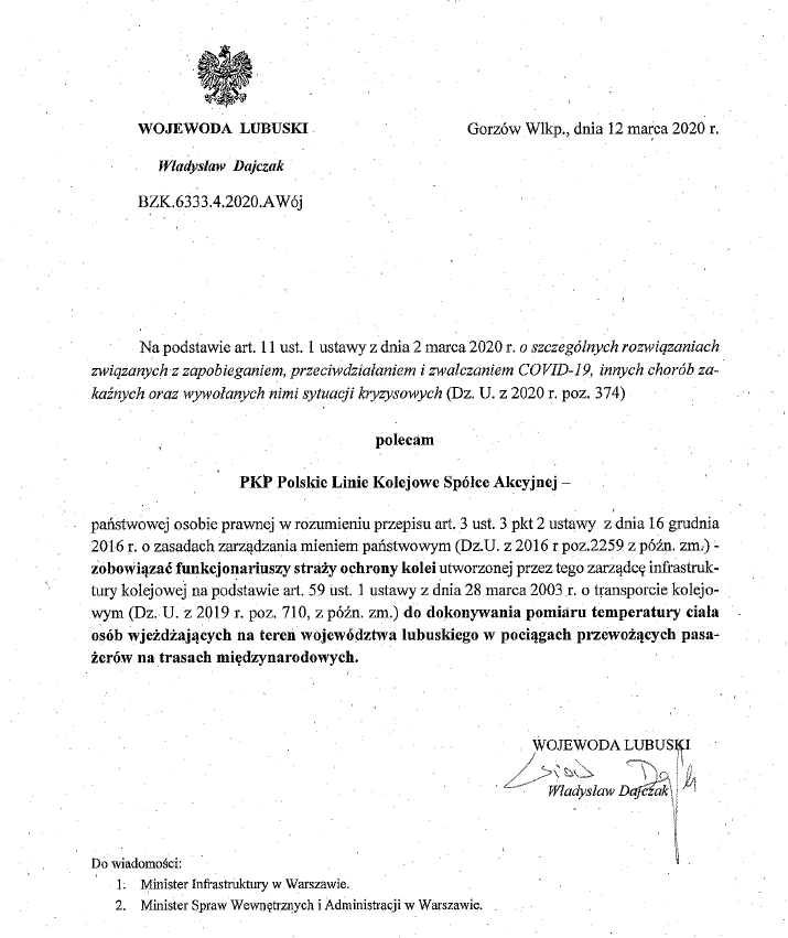 Polecenie Wojewody Lubuskiego - mierzenie temperatury podróżnych w pociągach