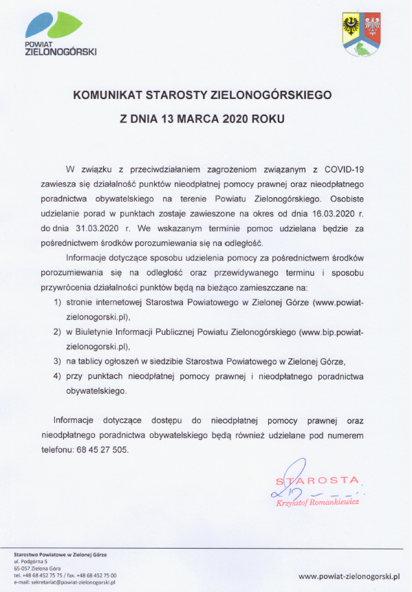 W sprawie zawieszenia działalności punktów nieodpłatnej pomocy prawnej oraz nieodpłatnego poradnictwa obywatelskiego na terenie Powiatu Zielonogórskiego