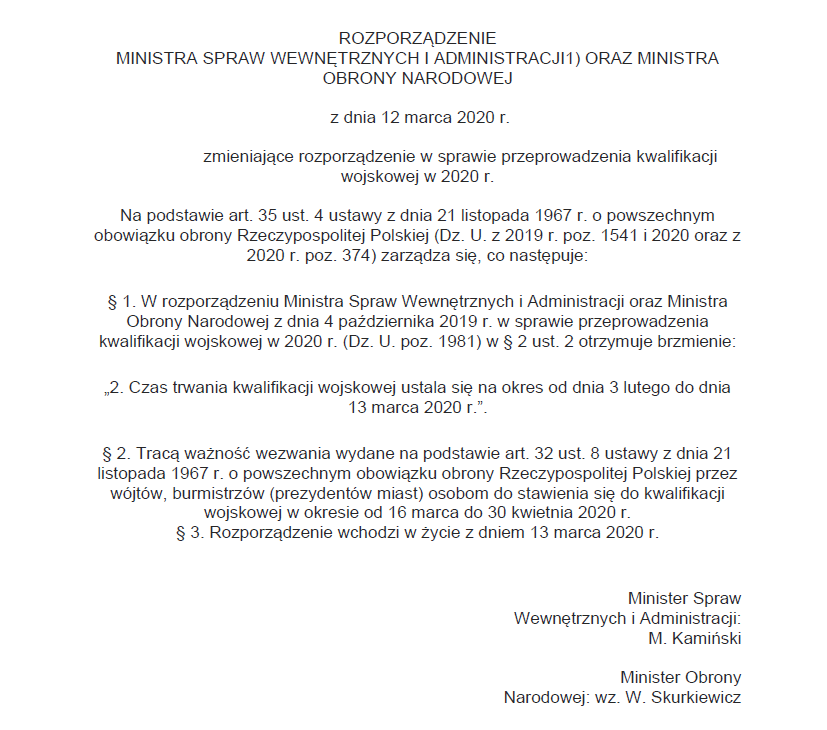 Rozporządzenie zmieniające rozporządzenie w sprawie przeprowadzenia kwalifikacji wojskowej w 2020